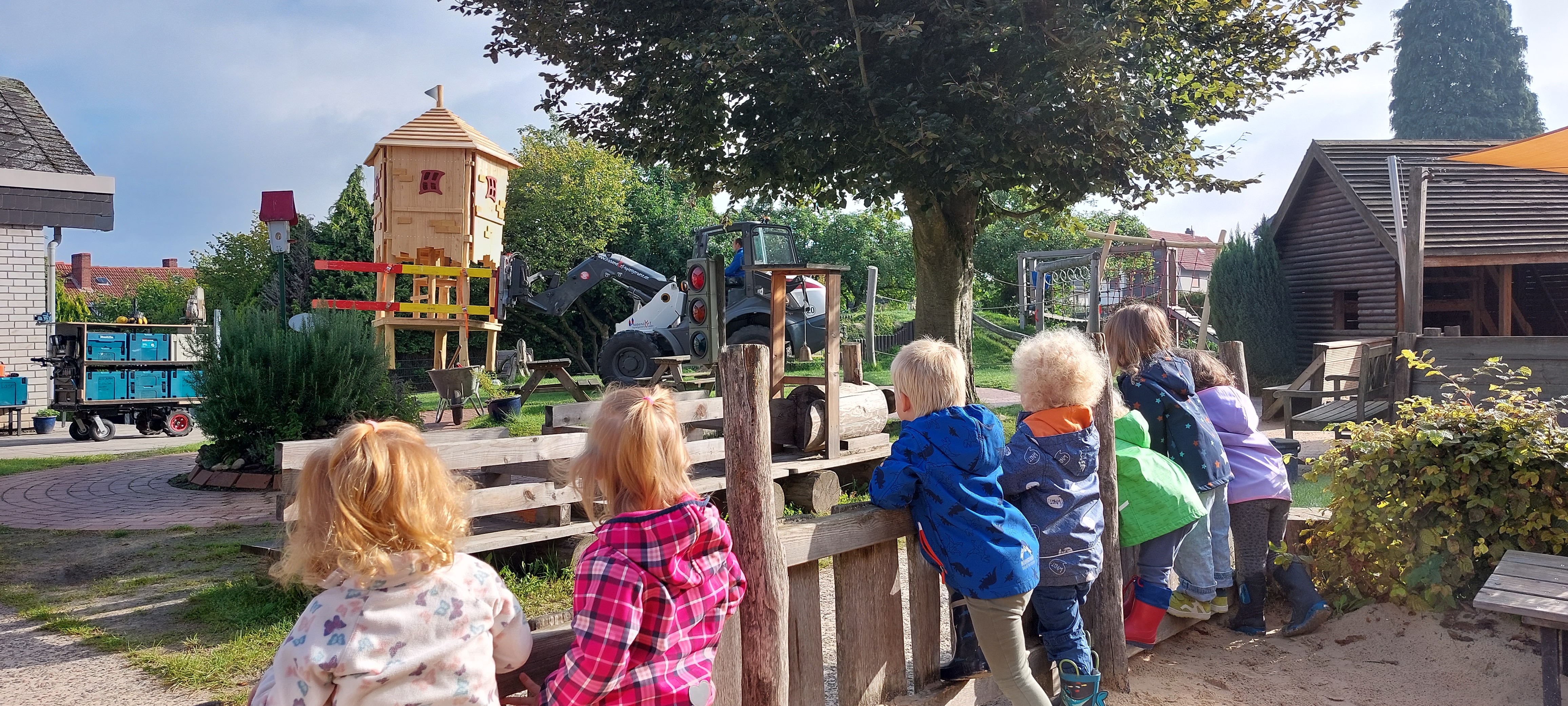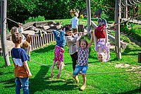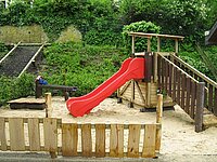 Unser Außengelände verfügt über viele Spiel- und Klettermöglichkeiten sowohl für die Jüngsten, als auch für die älteren Kinder.
